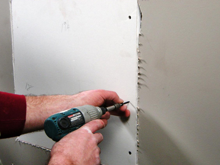 Set the drywall patch in place and screw it into the furring strips, sinking the screws beneath the surface of the drywall.